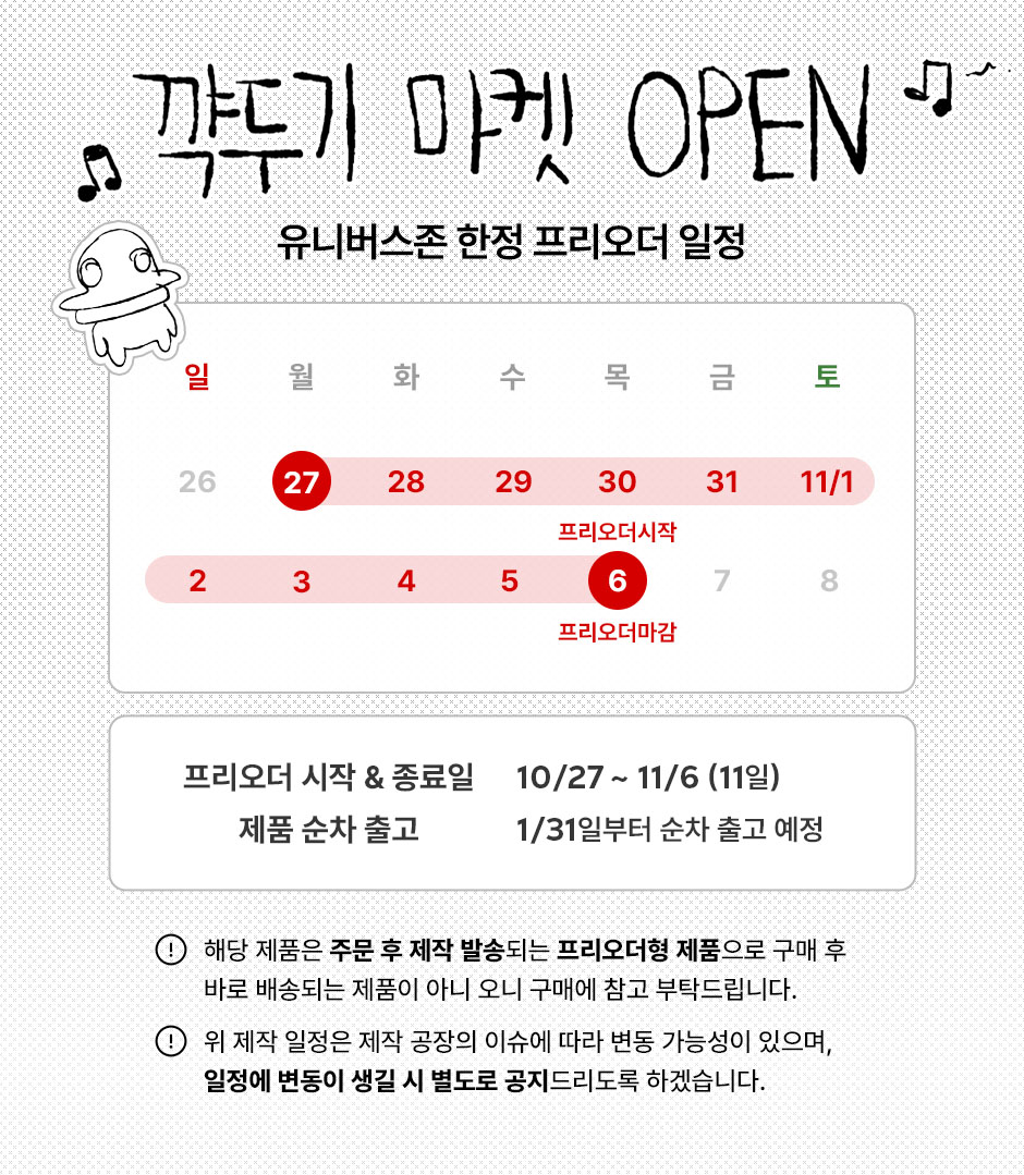 예상 제작 완료일은 각종 천재지변, 원자재나 부품의 지연, 설비 고장 혹은 사고 등의 사유로 변동될 수 있습니다.
